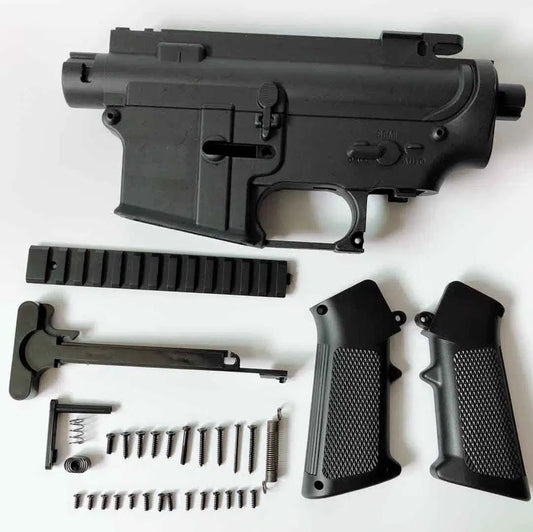 These are gel blaster receivers and some parts for the receivers. The receiver is the main shells of the gel ball blaster. It determines the overall strength and studiness of the gel blaster. It's also the place for holding gearbox and electronic parts for making the gel blaster running.
