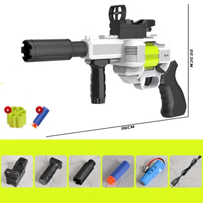 - Elektrischer automatischer Revolver-Schaumstoffpfeil-Blaster, angetrieben von 2 Schwungrädern.
