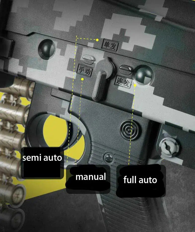 - Vielseitige Feuermodi: Wählen Sie zwischen manuellem, halbautomatischem und vollautomatischem Modus. Der manuelle Modus ermöglicht das Schießen ohne Batterien.