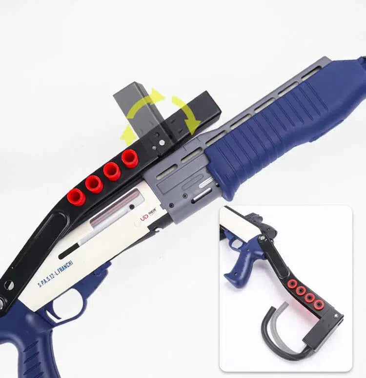 Este lanzador de dardos de espuma UDL SPAS-12 es una réplica a escala 1:1 de la escopeta SPAS-12 real. Fabricado en metal y nailon, simula el proceso de expulsión del cartucho original para una sensación realista. Cuenta con una culata plegable y rieles tácticos para un mejor agarre y maniobrabilidad en espacios reducidos. Tiene una capacidad de munición de 5 dardos y una potencia de fuego de 100 FPS.