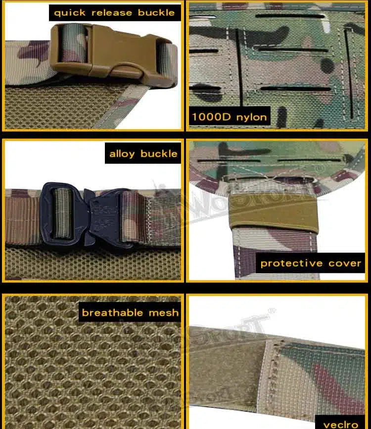 Este versátil conjunto de faja presenta un diseño modular con correas Molle, lo que le permite personalizar su equipo según sus necesidades y preferencias. Ya sea que necesite añadir bolsas, fundas o accesorios adicionales, el sistema Molle ofrece infinitas posibilidades de personalización.