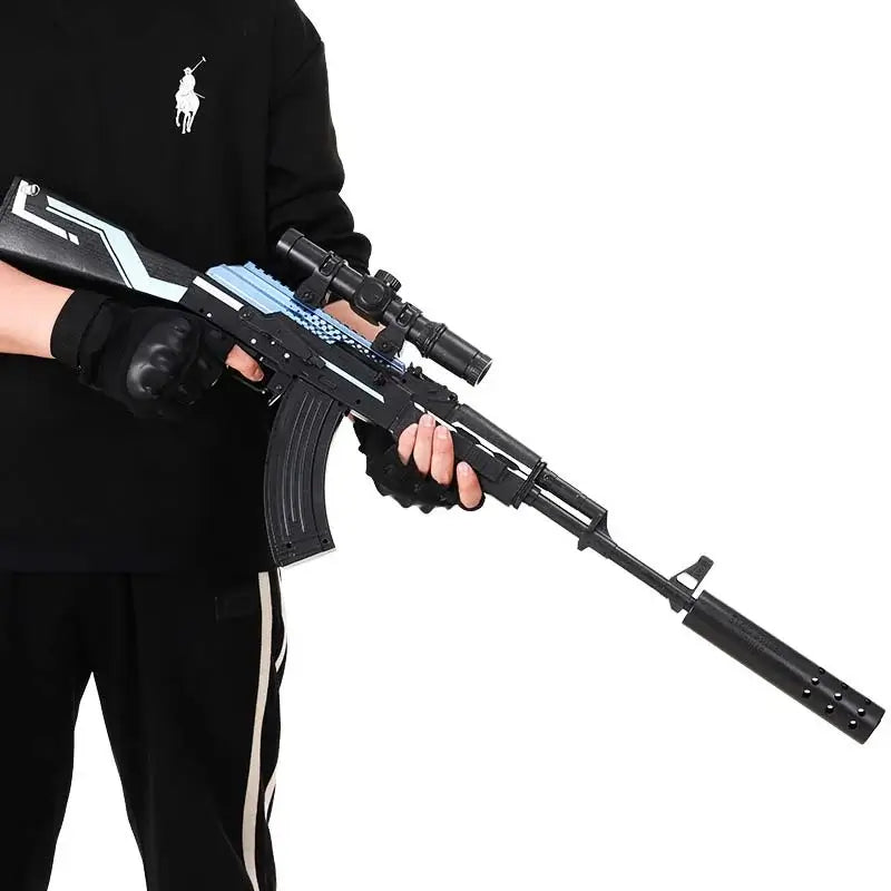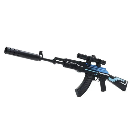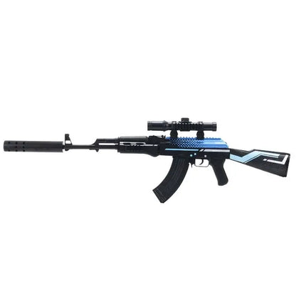 Experience the thrill of the AKM Shadow Assault Electric Blaster in eye-catching graffiti blue-black! This playful powerhouse fires gel balls at speeds up to 180 FPS with a 20m range. Switch between full auto and manual modes for varied play. Complete package includes scope, magazine, silencer, buttstock, gel balls, battery, charger, and safety goggles—everything you need for epic battles right out of the box!
