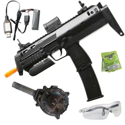 The BF MP7 V2 Submachine Gun Gel Blaster is the perfect realism-focused blaster for battles with friends. Featuring a mag fed design, adjustable butt stock, drum mag, and flip up sights, this blaster is a great choice for those wanting to get an edge on the field. For those who demand a high degree of realism in their gel blaster experience, the BF MP7 has it all.