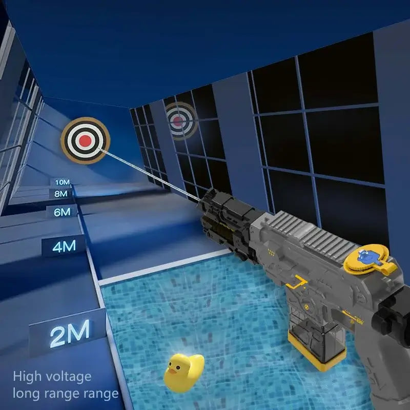 Get ready for some serious water warfare with our Electric Automatic Squirt Gun! This high-capacity water blaster has a 360° rotating nozzle for maximum drenching, with a waterproof design and a long range of 8 meters. Perfect for outdoor fun, it's also compatible with external bottles. So go ahead, make a splash!