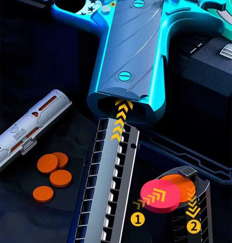 Upgrade your foam disc gun game with the Electric Blowback Colt 1911 Pistol. With its fully automatic shooting, powered by a large capacity lipo battery, it can reach distances of up to 15m. Made with safe EVA foam discs and featuring a sturdy blowback, this is the ultimate mag fed foam disc gun.