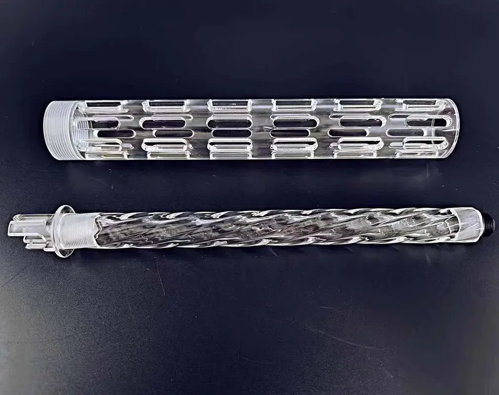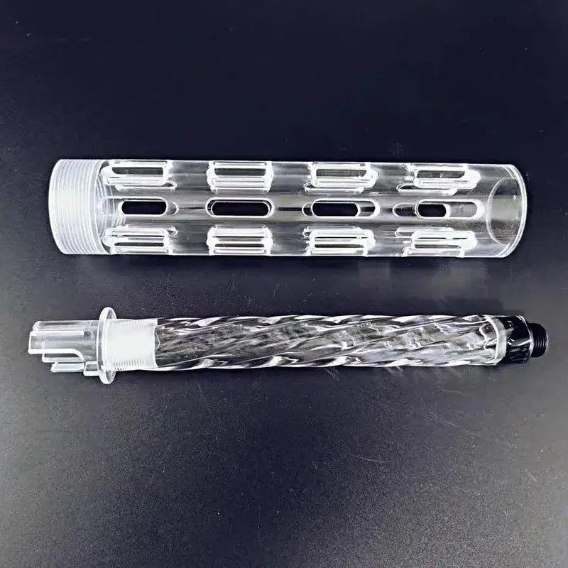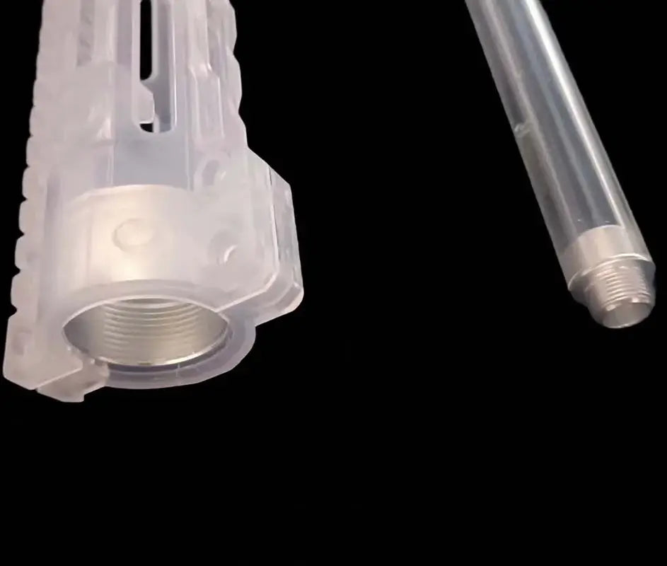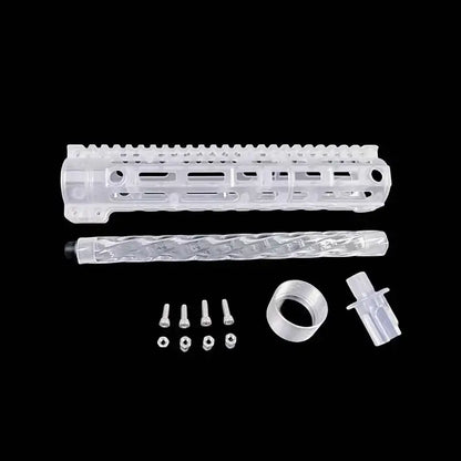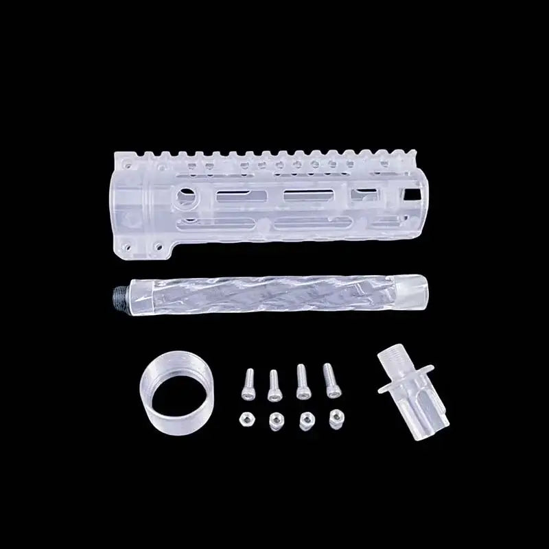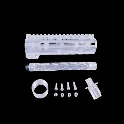 Precision-engineered F1 transparent nylon M-Lok handguard designed for v2 style gel blaster and airsoft receivers. Available in 5/7/10 inch lengths. Each unit includes a matching outer barrel for complete installation. The clear design offers superior visibility of internal components while maintaining tactical functionality.
