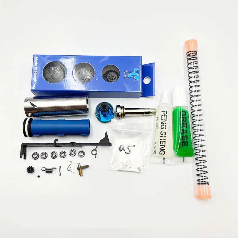 Upgrade the gearbox on your Ldx, Cyma, Jingji SLR, PDX, SR16 or ldt hk416, ldt mp5 gel blaster with this parts kit to improve FPS and durability. Featuring SHS steel gears, stainless steel cylinder, metal nozzle, and more, all backed by industry expertise. Includes shims, bearings, and greases for optimal performance.