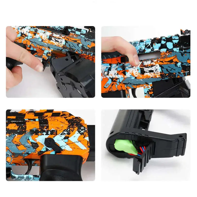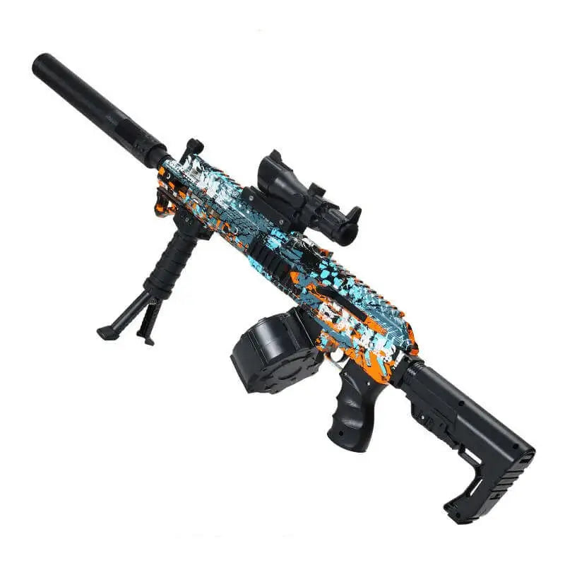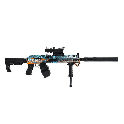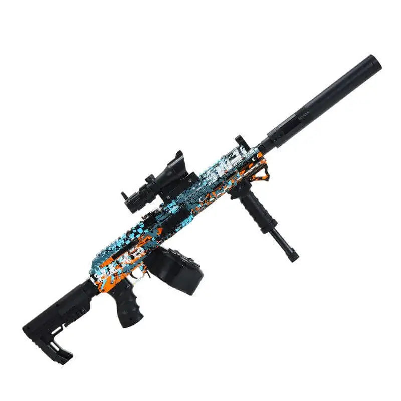 Unleash your inner warrior with our Graffiti Electric AK Orbeez Gun! Switch between manual and full auto modes for maximum fun! Complete package includes everything you need: 16x magnifying scope, bipod foregrip, drum mag, battery, charger, buttstock, suppressor, and gel balls.