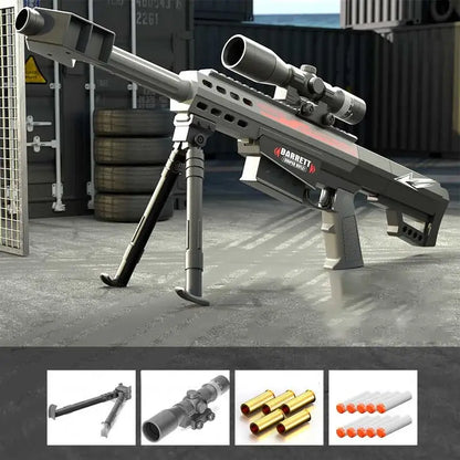 Get ready for some serious fun with the Handi Barrett Manual Reload Shell Ejecting Foam Dart Blaster! This mini-sized, lightweight toy gun features a folding receiver for easy reloading or ejecting shells, with the butt stock acting as a charging handle. Perfect for sniping with 55 FPS firepower and a firing range of 12-15m. Available in grey, blue, or tan.