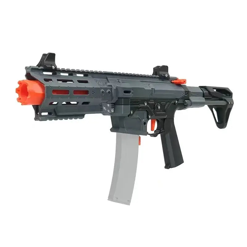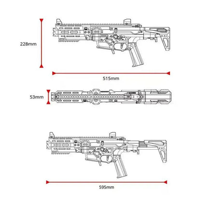 The Hildolfr 737 Full Auto Flywheel Nerf Blaster 3D Print Kit is perfect for close-quarters combat (CQB) scenarios. Inspired by the AR-15 rifle, it features a compact and efficient design optimized for swift and precise engagements in narrow spaces. With a realistic structure and compatibility with Worker Talon Short Darts and magazines, this blaster offers a tactical advantage.