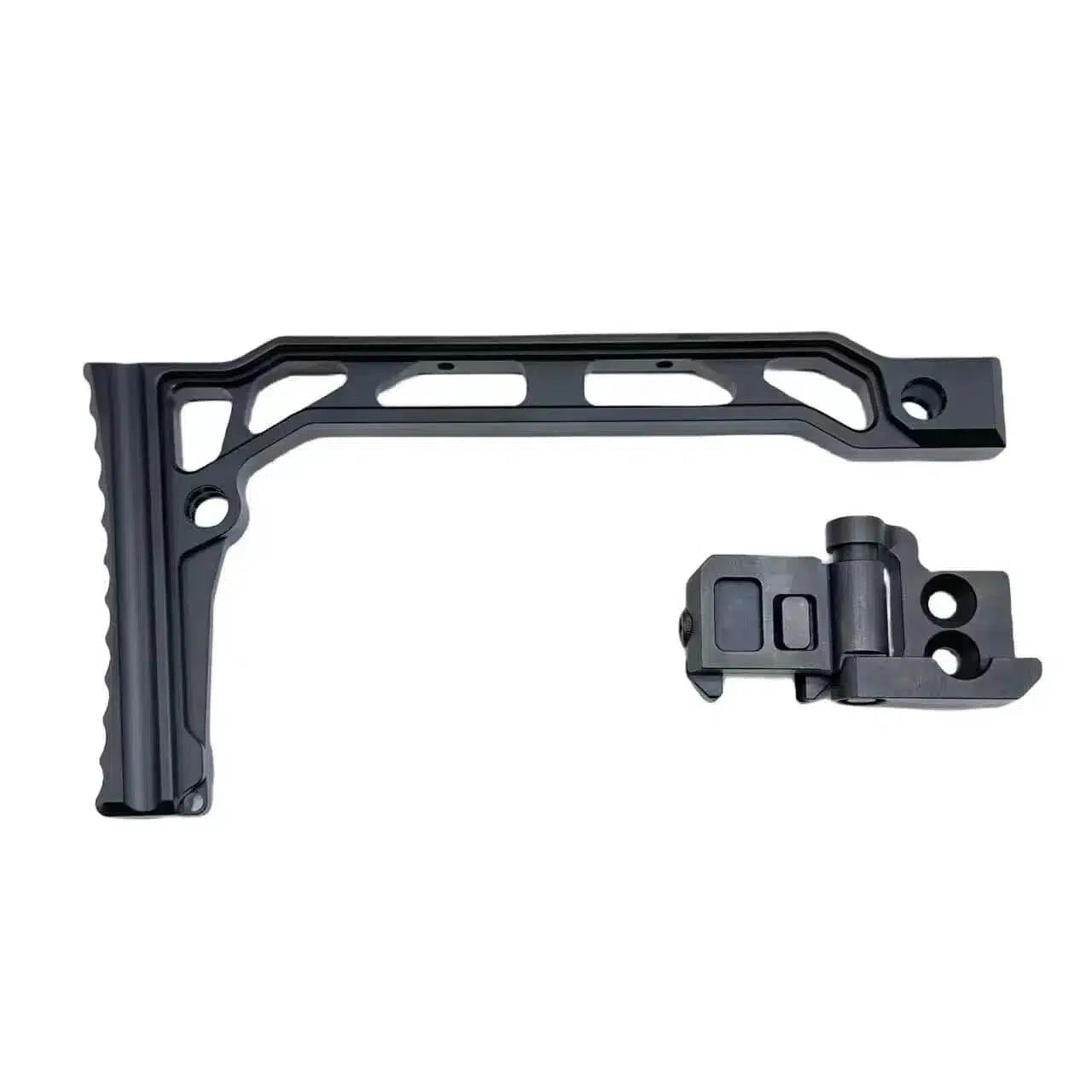 The JMAC SS-8R Skeleton CNC Folding Butt Stock replica made by LDT is a must-have for all mp5 enthusiasts. Crafted with precision from high-quality CNC alloy metal, it offers unbeatable durability. Need use the adapter to fit for your ldt mp5 mp5k, AR or alpha king gel blaster.