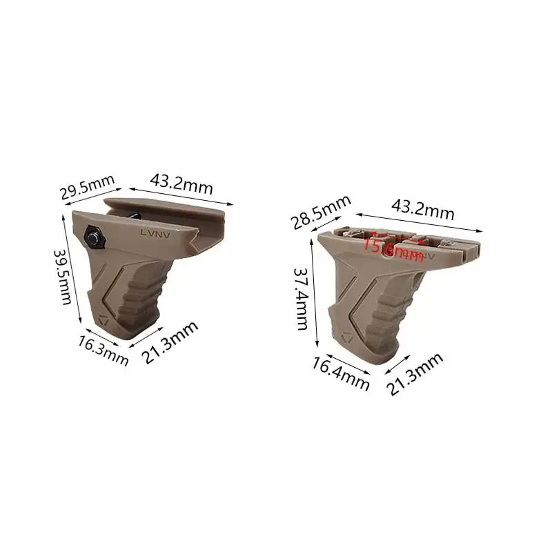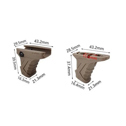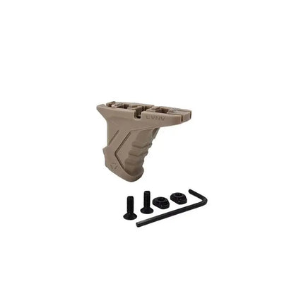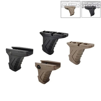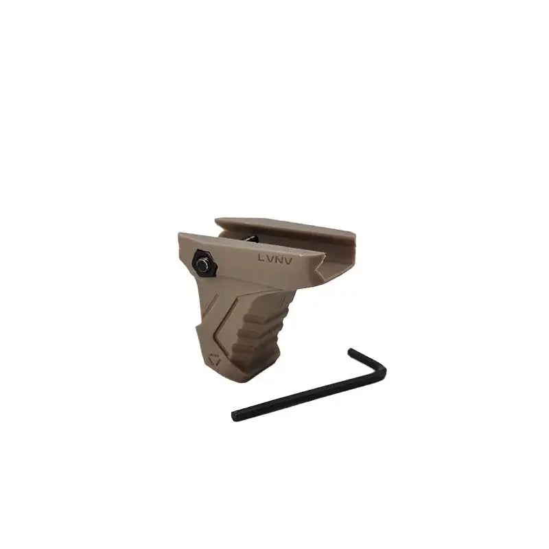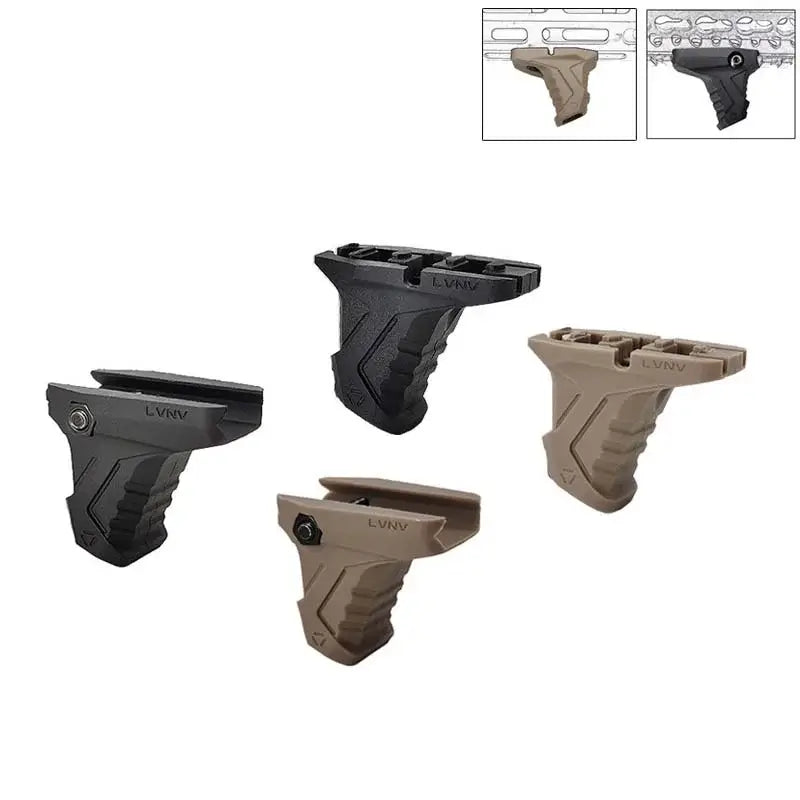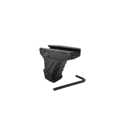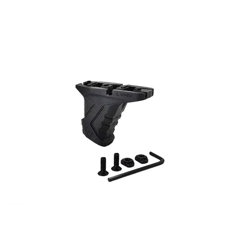 The LVNV Angled Handstop offers a built-in cable management system for excess wire storage, a rearward angle for improved weapon control, textured finger areas for a secure grip, and a built-in barricade stop. Compatible with 20mm or m-lok rails, it is lightweight at just 24g.