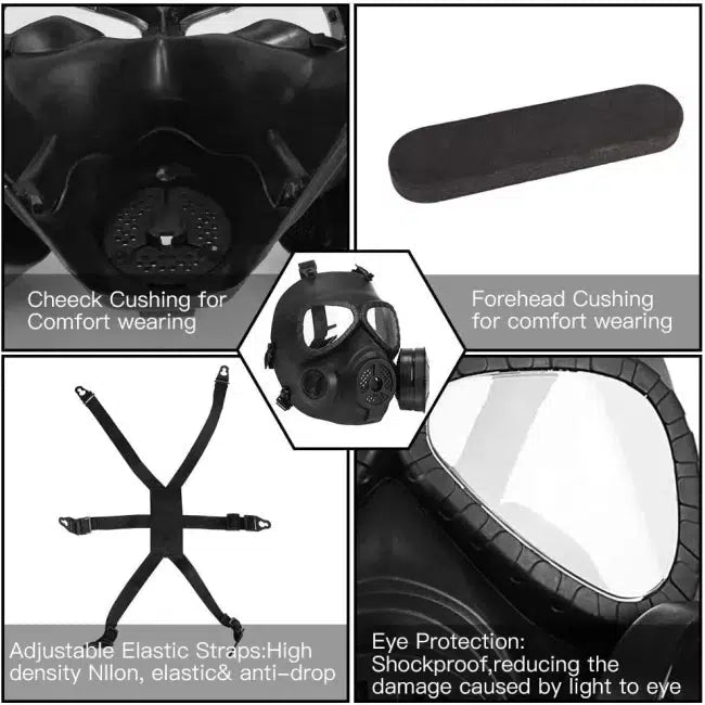 The M04 Tactical Protective Toxic Gas Safety Mask is designed for maximum safety and comfort. It features a stretchy adjustable neoprene headband that fits most teens and adults, and a high-density nylon strap that keeps the mask stable. Made of shock-resistant engineering plastic TPU, the mask also has an extra-comfortable EVA head cushioning pad. Its exhaust fans in each side promote the flow of air and eliminate fogging, for a clear and broad vision.