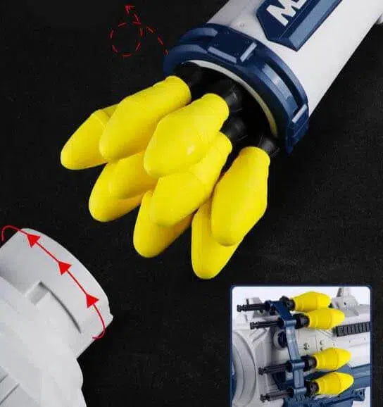 This M22X 8-Hole Semi-Auto Soft Foam Blaster Rocket Launcher is with easy and fast loading capabilities, battery operated firing, and a 1x magnification optic, this launcher provides a 8-10m shooting range and comes with 8 rockets. Its vibration, sound, and smoke effects add an extra level of realism, and the convenient side mounted storage rack allows for easy access.
