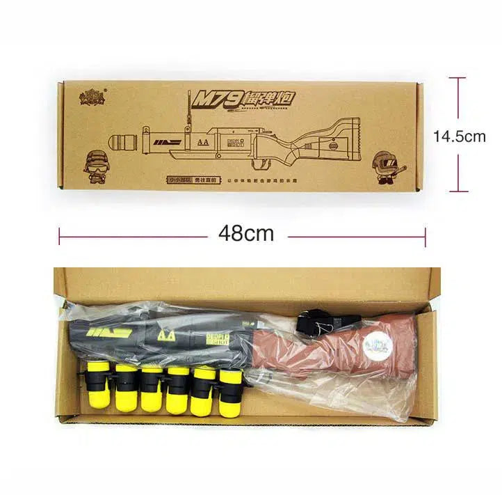 The M79 grenade launcher soft bullet toy is a single-shot, shoulder-fired, fragmentation grenade launcher for launching 40×46mm grenades. It uses what the US Army calls a high-low propulsion system to maintain low recoil. It first appeared in the Vietnam War.
