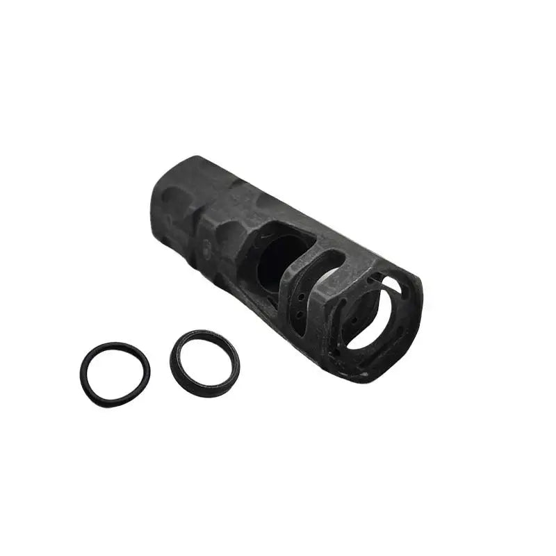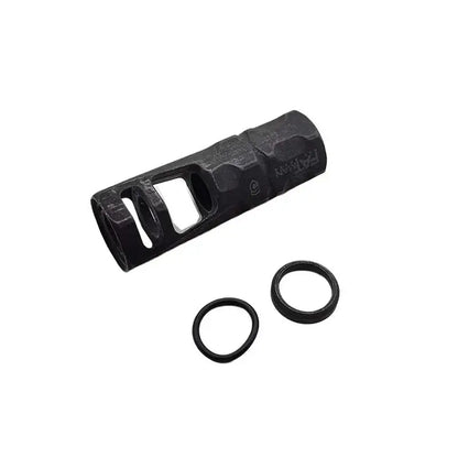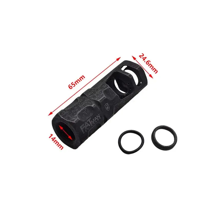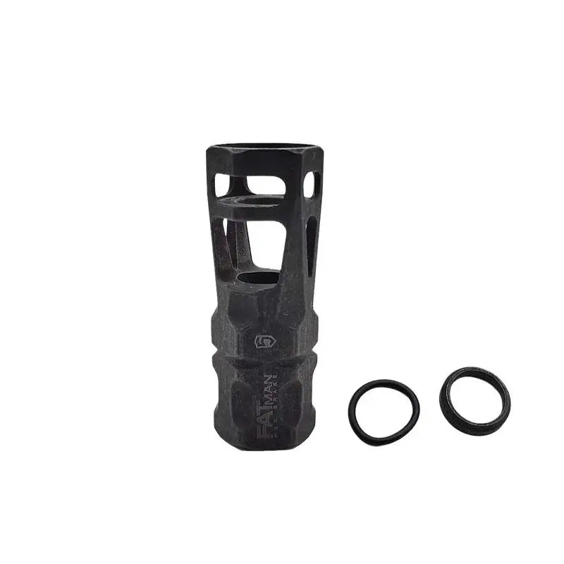The Phase 5 Fatman Hex 14mm CCW Muzzle Brake offers two large ventilated baffle sections and chambers. Its two top ports, machined at a 20-degree forward angle. Made of durable metal, this black muzzle brake is compatible with gel blasters and airsoft guns. The included crush washer ensures easy installation.
