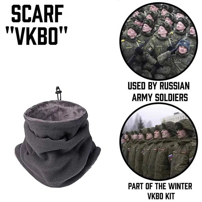 The VKPO (VKBO) scarf is part of the standard issue all season clothing system used by the Russian military. It is often used when temperatures are cold enough to require a scarf and not cold enough to require a balaclava. The scarf can also be transformed into a hat or helmet lining.