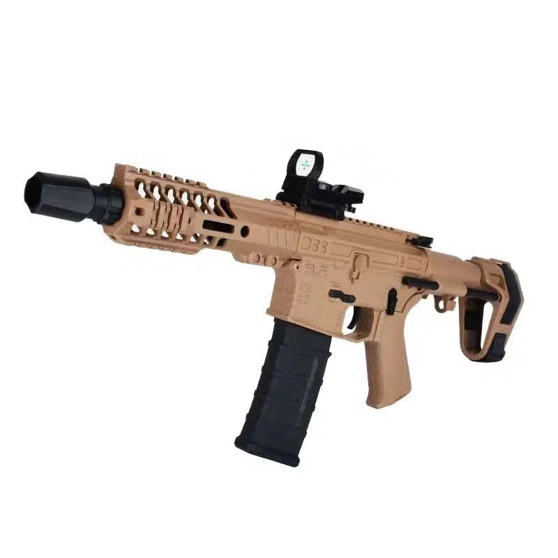 The Sembylon SLR Blowback Electric Orbeez Gun is designed with attention to detail, featuring a sleek SLR letter print on the receiver. Easily prime the gun with the pull of a charging handle and experience blowback action. With a retractable butt stock and compatibility with jingji pmag magazines, this gun is customizable to your needs. Available in black, white, tan and clear.