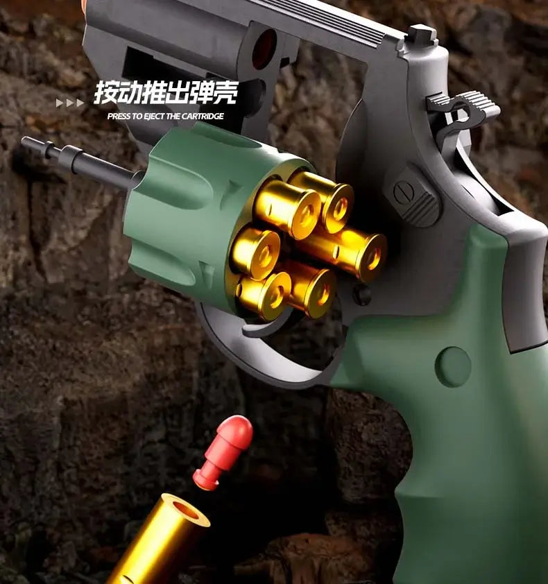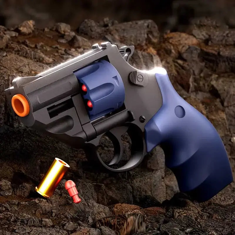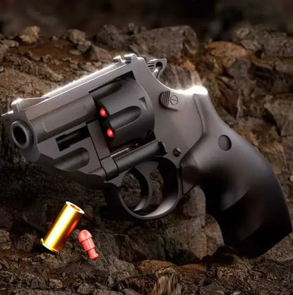Introducing the Sky Marshal TB500 Double Action Revolver Soft Bullet Toy Gun! With a realistic design and double-action mechanism, this gun provides semi-automatic shooting for 8-10m. Easy to use and reload, plus a side rail for attachments. Get ready for some fun!