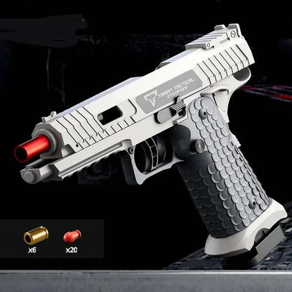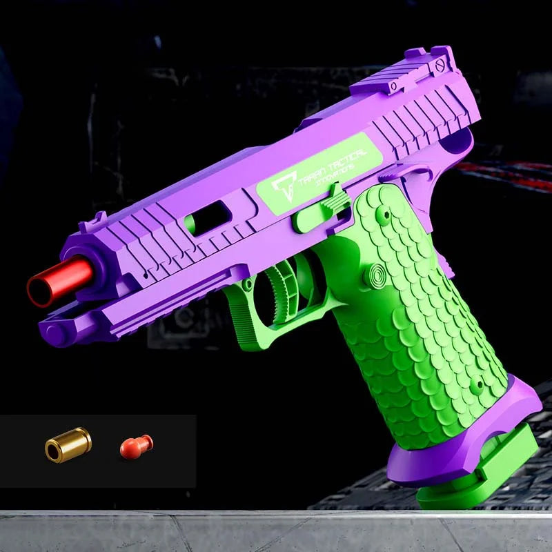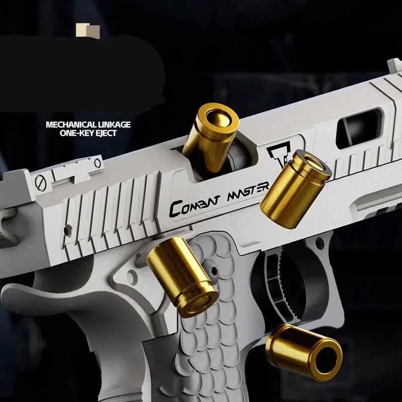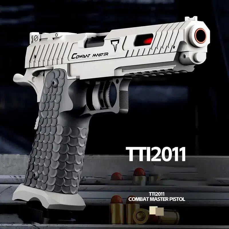 The TTi Combat Master 2011 Cartridge Ejection Soft Bullet Toy Gun is a semi-automatic toy gun that shoots soft darts with precision. With its ejecting cartridge shells, the slide will enter a hold-open status after firing the last round. Its cool combat master 2011 pistol design comes in two color variations and has a shooting range of 8-10m. Perfect for honing your marksmanship skills.