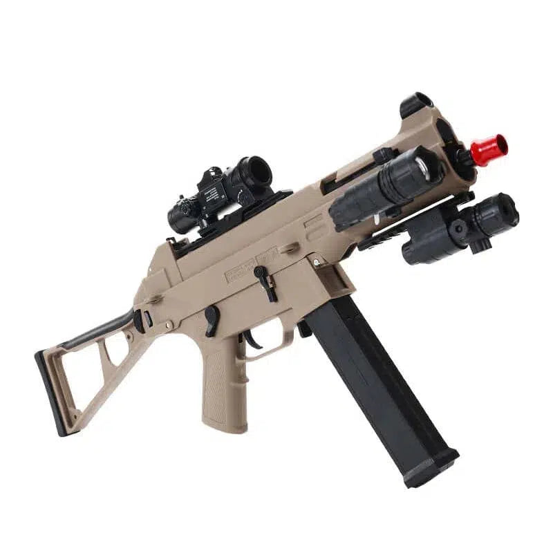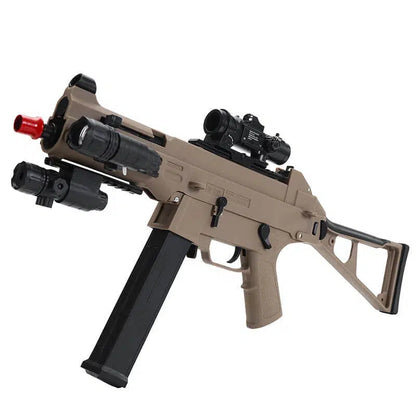 The UMP 45 Gel Ball Blaster in the colour tan has a variety of new features. This gel blaster is perfect for anyone just getting into the gel blaster sport. It has gen8 gearbox, a foldable stock, a scope, flashlight, laser and even has an alloy barrel.