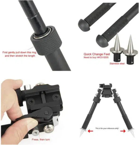 - Lightweight, aluminum bipod features durable stainless steel locking components and grippy rubber feet to give you a rugged, sure-footed shooting platform.