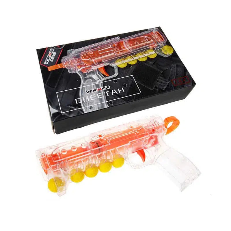 The Worker Cheetah Blaster is a single shot, spring powered design that shoots rival ammo and can also be converted to fire darts. Offering internal ball storage paired with a compact, transparent design.